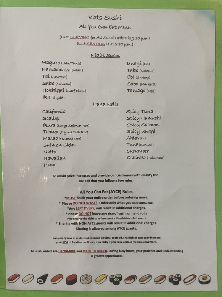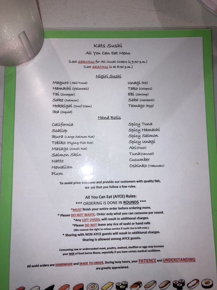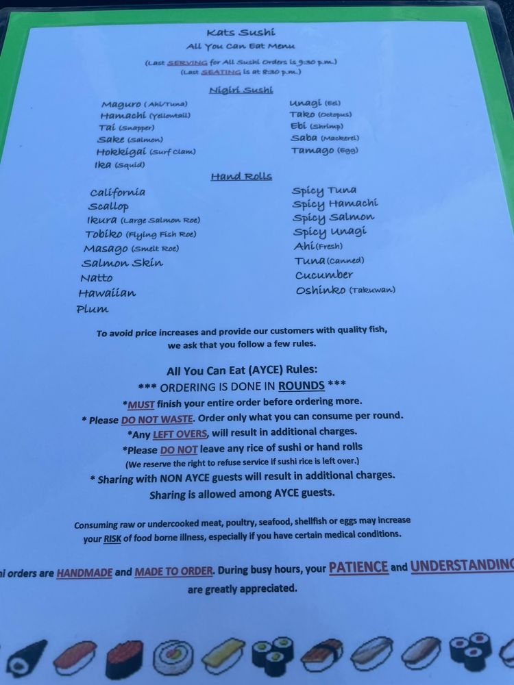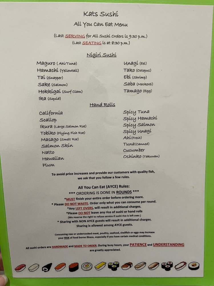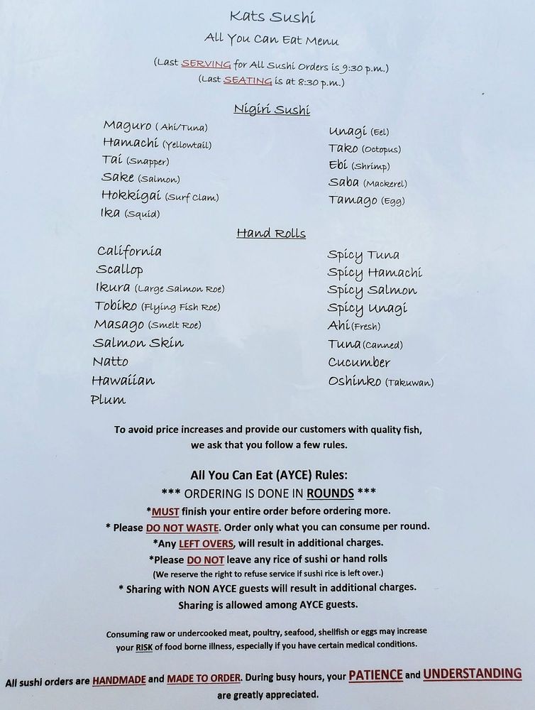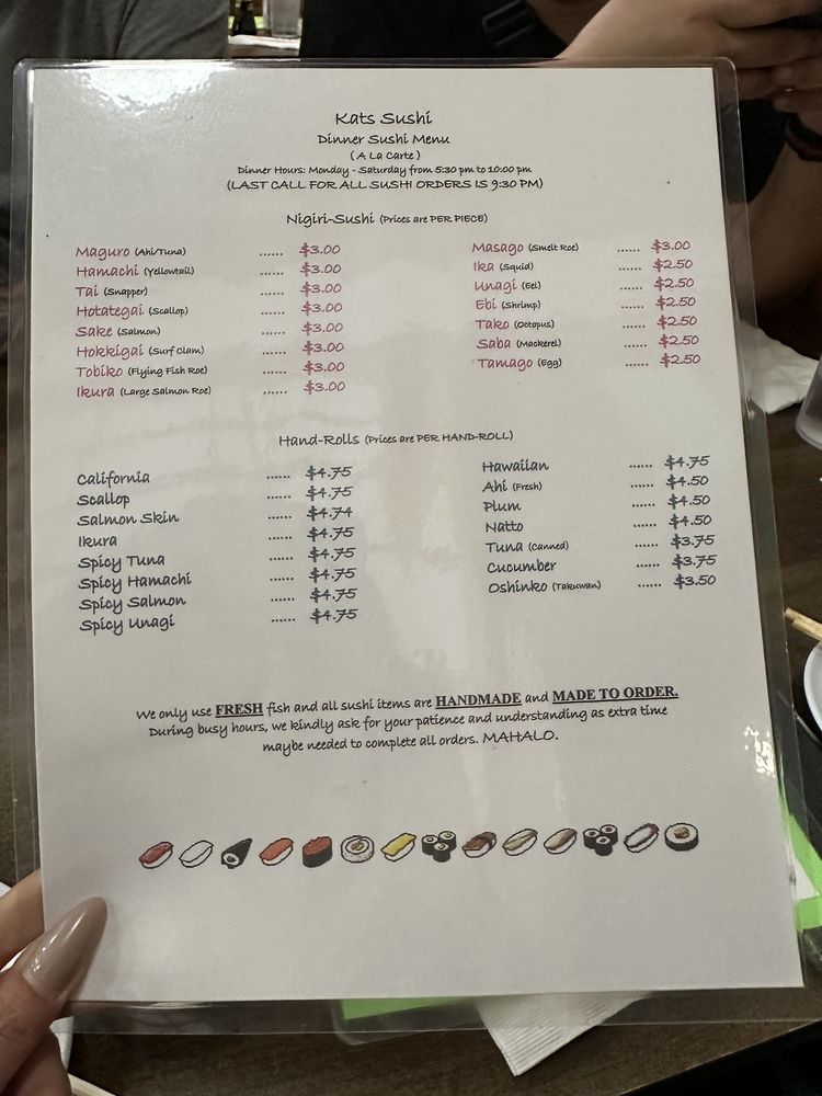 Kats Sushi is a hidden gem located in Honolulu, offering a delightful all-you-can-eat sushi experience. The menu boasts a variety of nigiri and hand rolls, including favorites like Maguro, Hamachi, and Spicy Tuna. Customers rave about the fresh and flavorful sushi, made to order with excellent service. The cozy vibe and BYOB policy add to the charm of this family-owned establishment. With quick service and a well-balanced rice-to-fish ratio, Kats Sushi stands out as a must-visit for sushi lovers. Don't forget to make reservations in advance to secure a table for this exceptional dining experience.