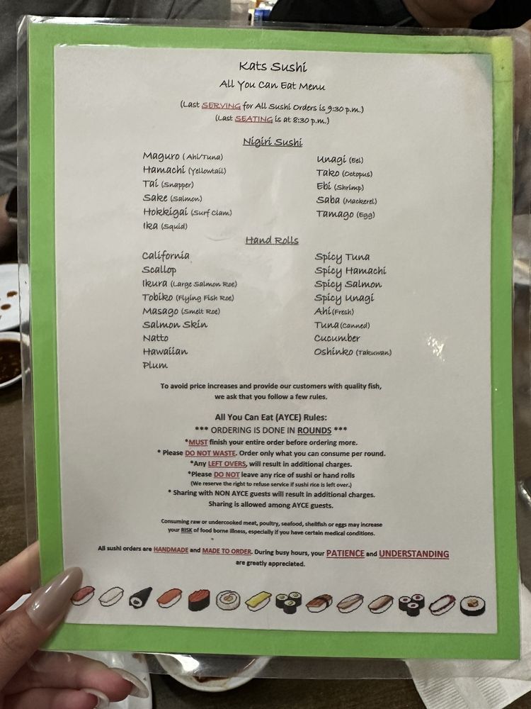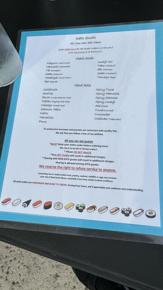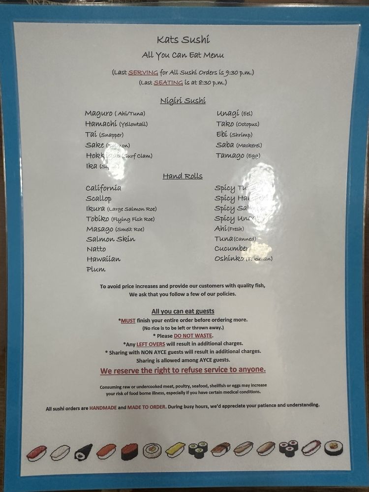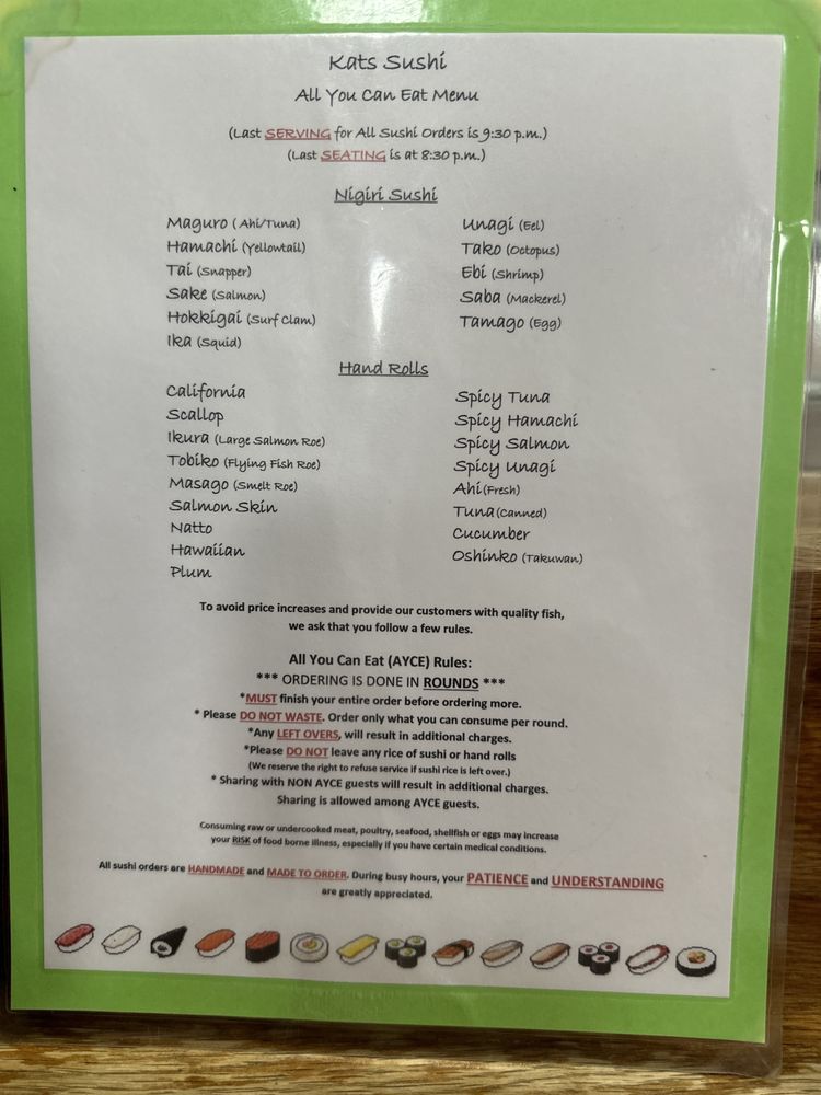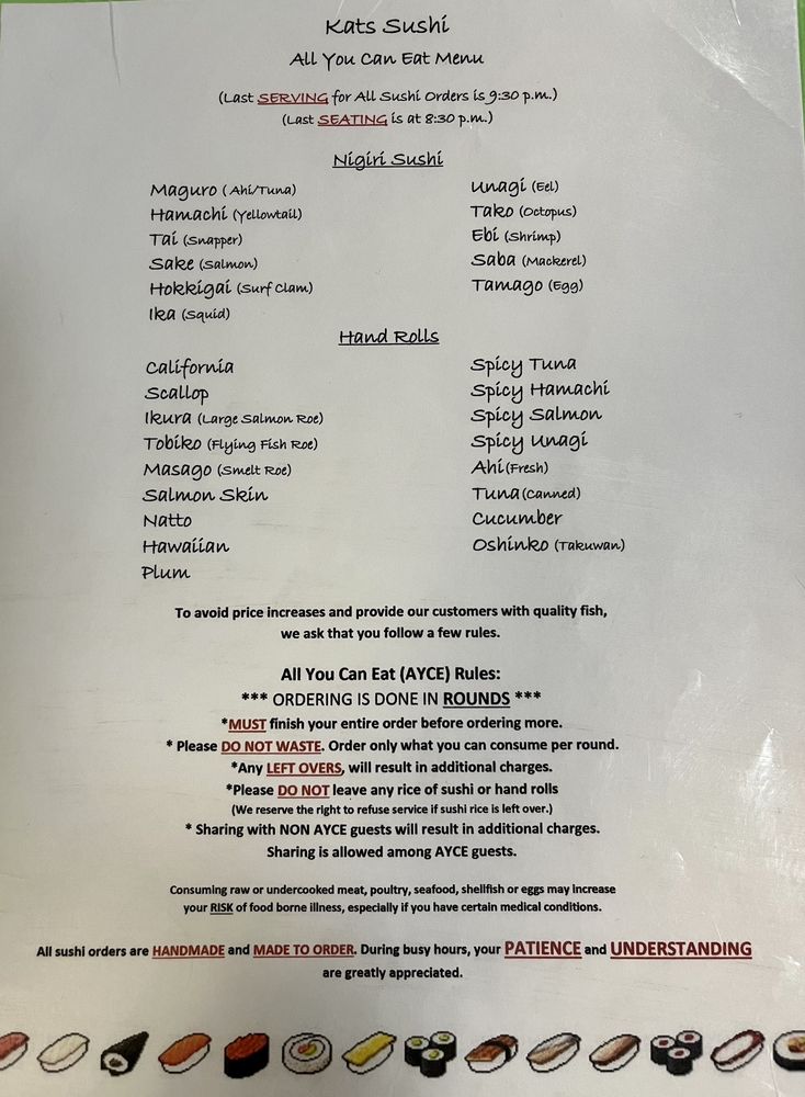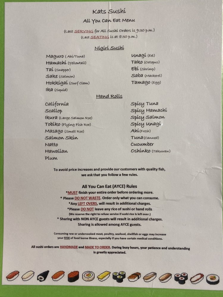 Kats Sushi is a hidden gem located in Honolulu, offering a delightful all-you-can-eat sushi experience. The menu boasts a variety of nigiri and hand rolls, including favorites like Maguro, Hamachi, and Spicy Tuna. Customers rave about the fresh and flavorful sushi, made to order with excellent service. The cozy vibe and BYOB policy add to the charm of this family-owned establishment. With quick service and a well-balanced rice-to-fish ratio, Kats Sushi stands out as a must-visit for sushi lovers. Don't forget to make reservations in advance to secure a table for this exceptional dining experience.